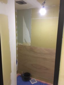 洗面台や吊戸棚、手すり、タオル掛け等、壁に対してビスで固定をする際は写真のように部分的にベニヤで補強をします。