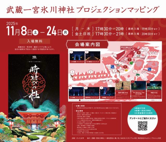 地元大宮で盛り上がっている、 武蔵一宮 氷川神社 プロジェクションマッピング「時結びの杜」⛩️ 🌟 ![]() 各SNSでも注目されていますが、さいたま市が、大宮盆栽村開村100周年を記念して企画したイベントで、氷川神社では初となるプロジェクションマッピングを含むライトアップイベントが行われています。 普段立ち入ることのできない夜の境内が、光と音に包まれる――。 生まれた頃から数えきれないほど参詣してきた氷川神社ですが、この夜の姿はまさに別世界。 ![]() 境内の大きな木には、イベントテーマである ![]() そして、圧巻だったのが、楼門に映し出されるプロジェクションマッピング! 約7分間、その美しさに魅了されました!! ![]() ![]() ![]() ![]() ![]() ![]() ![]() ![]() ![]() まさに、光と音のファンタジー! 楼門が光の絵巻へと姿を変え、氷川神社にまつわる神話、大宮の歴史と街並み、世界に誇る盆栽文化、そして見沼の龍が天へ昇るストーリーが、鮮やかに表現され、思わず息をのみました。 二千年の時を刻む楼門が、夜空に浮かび上がるように輝くその姿は、“今だけの特別な魔法”のようでした。 今回の「時結びの杜」は、私にとって、地元の誇りを再認識するひとときでした。 歴史を受け継ぎながら、未来へ向かって歩んでいく。 ![]() ![]() ![]() ![]() ちなみに普段の氷川神社はこちら ![]() Youtubeから拝借 XR_KOMBO様 【大宮氷川神社プロジェクションマッピング 2025】「時結びの杜」をベストビューポイントから鑑賞! |