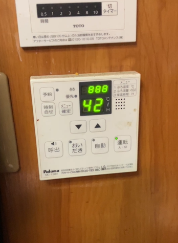 給湯器のリモコンの時間を表示する部分が点滅しているとお問合せをいただき点検に行ってまいりました。写真のように888の表示が点滅して、時間が表示されなくなっていました。
