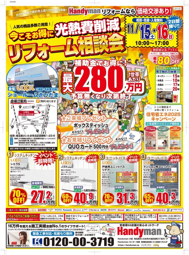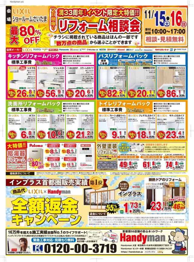 こんにちは、大宮店の森です。 本日11/15(土)と明日11/16(日)に【LIXILショールームさいたま】にてイベントを行います!!! ![]() ![]() ご来場いただいた方限定で特価価格でのご案内や、ご成約特権のオプションサービス等がございます! また、ティッシュのプレゼントや、現地調査の予約が取れた方には500円分のQUOカードプレゼントも行っていますので、是非ご来場ください!!! ・ 事前にお電話にてご予約をいただきますと、ショールームのコーディネーターさんがついて、商品の案内をいただけますので、弊社大宮店もしくはコールセンターにお電話をいただけますと幸いです。 大宮店TEL:048-631-2525 ・ 実際に商品を見ていただき、概算金額のお伝えや、現地調査の日程までを組めるイベントとなりますので、 リフォームをご検討中の方はお気軽にご来場ください⛄🍂 LIXILショールームさいたま 住所:埼玉県さいたま市北区吉野町1-23-6 |