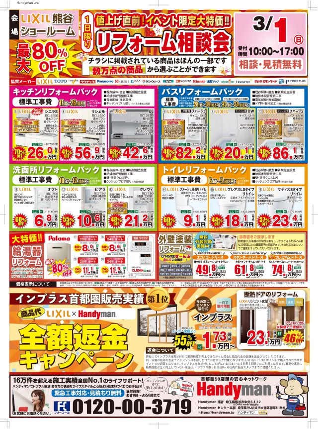 ご覧いただきありがとうございます。 本日3/1(日)の1日限定でLIXIL熊谷ショールームにてリフォーム相談会を実施いたします! ◉リフォームをしたらどれくらいの金額になるのか気になる方 ぜひご来場くださいませ🌟 ★ご来場プレゼント:ボックスティッシュ スタッフ一同、心よりお待ちしております📣 📍LIXIL熊谷ショールーム ![]() ![]() |