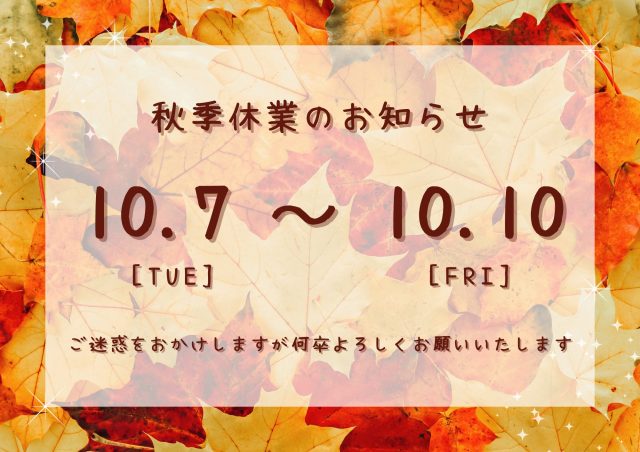 こんにちは!越谷店の永田です! 今回は秋季休暇のお知らせです🍂 ![]() 上記期間にいただいたご連絡については10月11日(土)以降に順次対応をさせていただきます! ※コールセンターは平常通り受付を行っています。 ご不便をおかけしますが、ご理解のほどよろしくお願い申し上げます。 |