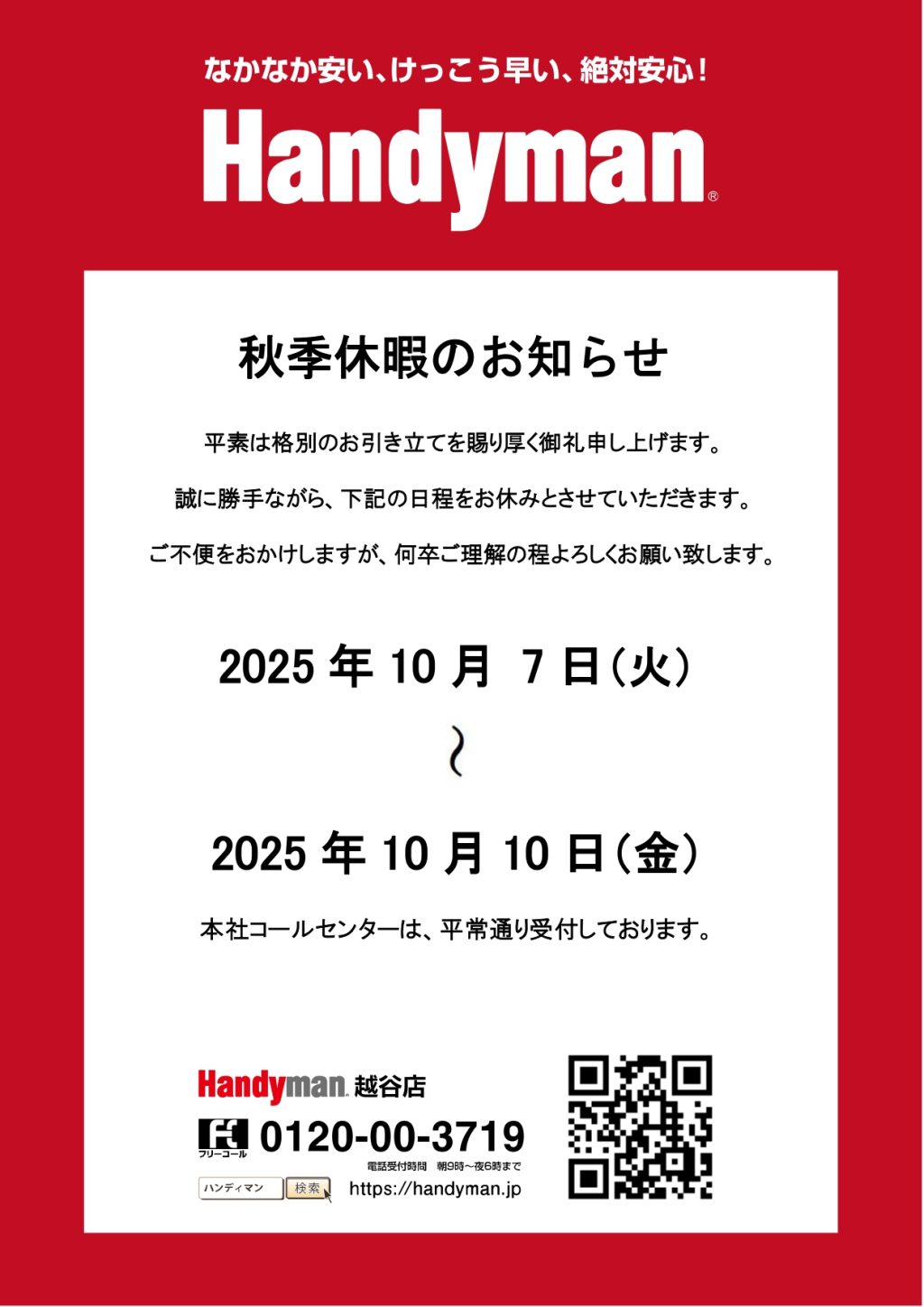 大野 由香里2025.10.0610/7(火)~10/10(金)ロングバケーションのため休業いたします 投稿日 2025年10月6日 著者 大野 由香里 スタッフブログカテゴリー 大野 由香里 ツイート ご迷惑をおかけ致しますがよろしくお願いいたします。 お風呂、洗面所の施工事例 大野 由香里一覧へ戻る 関連記事ookuma-k2017.08.01LIXIL:アメージュZ便器が人気の理由落合 佑介2025.04.18LIXIL:ナビッシュ岡元 歩2021.03.02ボロボロになった配管テープ直しますorikasa-t2018.07.29筋トレしました😳蜷川 黎2023.10.27初体験、、、