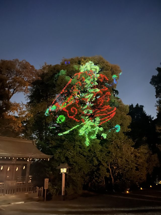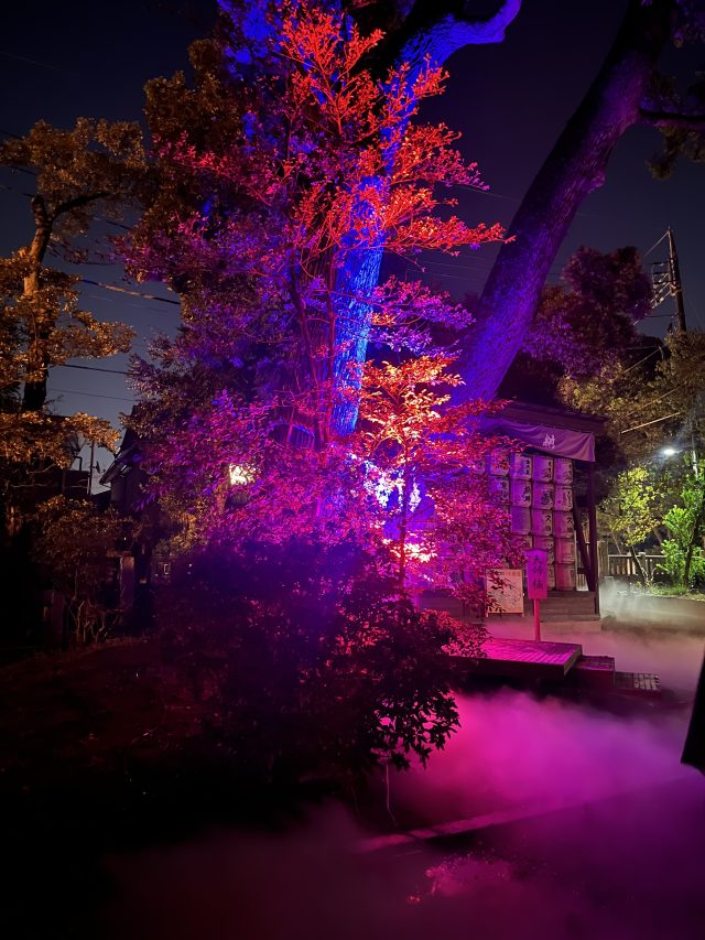 こちらは夫婦楠のライトアップ。 スモーク漂ってこの色合いはちょっとなんか、うん。