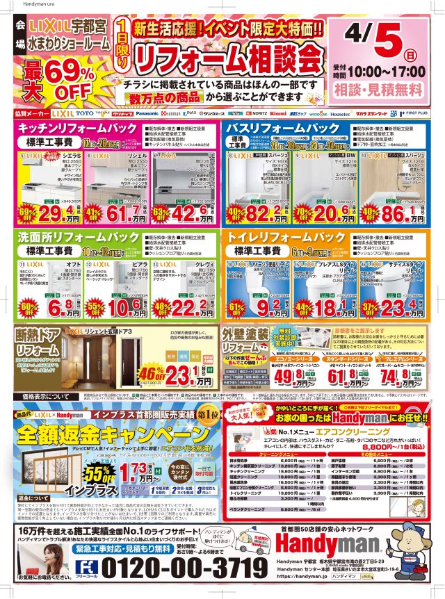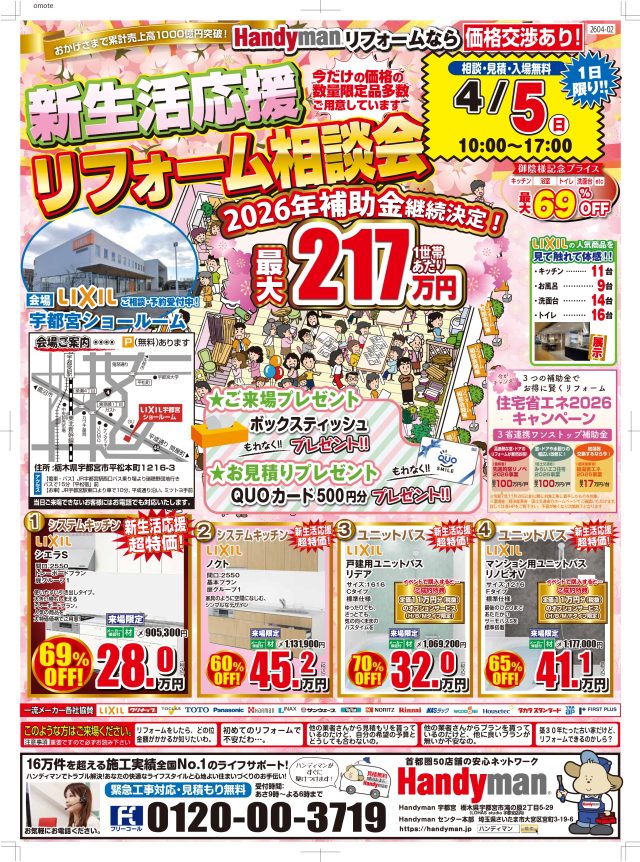 ご覧いただきありがとうございます。 宇都宮店の末廣です。 今週末、4/5(日)にLIXIL宇都宮店のショールームにてリフォーム相談会を実施いたします! 🌟 実物を見ながら詳しく相談したい方 🌟 古い家だけど、リフォームできるのか気になる方 🌟 まだ先だけど話だけでも聞いてみたい方 ~是非ご来場くださいませ(^^♪~ ※当日ご来場できないお客様にはお電話でも対応いたします。 スタッフ一同、心よりお待ちしております!💪 LIXILショールーム 宇都宮店————————————————————————— ——————————————————————————————————————- ![]() ![]() |