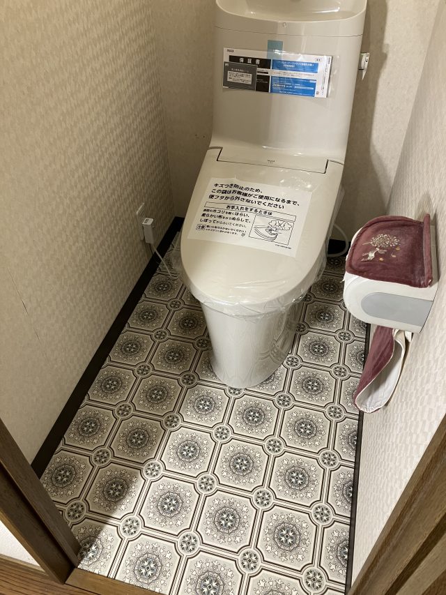 今回内装は壁紙はそのままで床のCFとソフト巾木のみの貼替でしたが、施主様がお選びになったタイル柄がトイレの印象をパッと大きくオシャレに変えてくれています。 柄ものは選ぶのに勇気がいるのか、意外と出会う機会が少ないのですが、トイレや洗面室は他とは切り離された空間だからこそ遊び心を入れたデザインでも違和感が出にくいです。 今はInstagramなどのSMSでも色々な施工例を気軽に見ることができますので、「こんなイメージにしたい!」という画像をご用意いただければそれに近付けることも可能ですので是非ご相談くださいませ! |