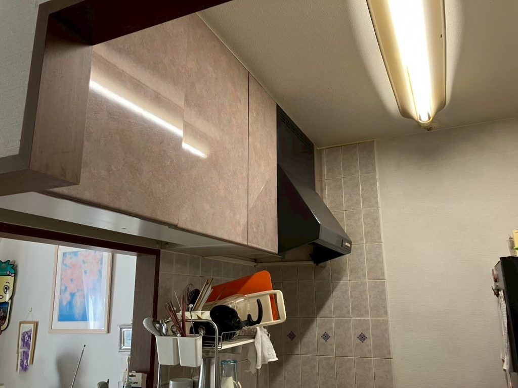 今回はキッチン工事と合わせてキッチンの天井照明もLEDに交換しております。 扉の色が白いことも相まって、キッチン全体がパッと明るい雰囲気になりました。