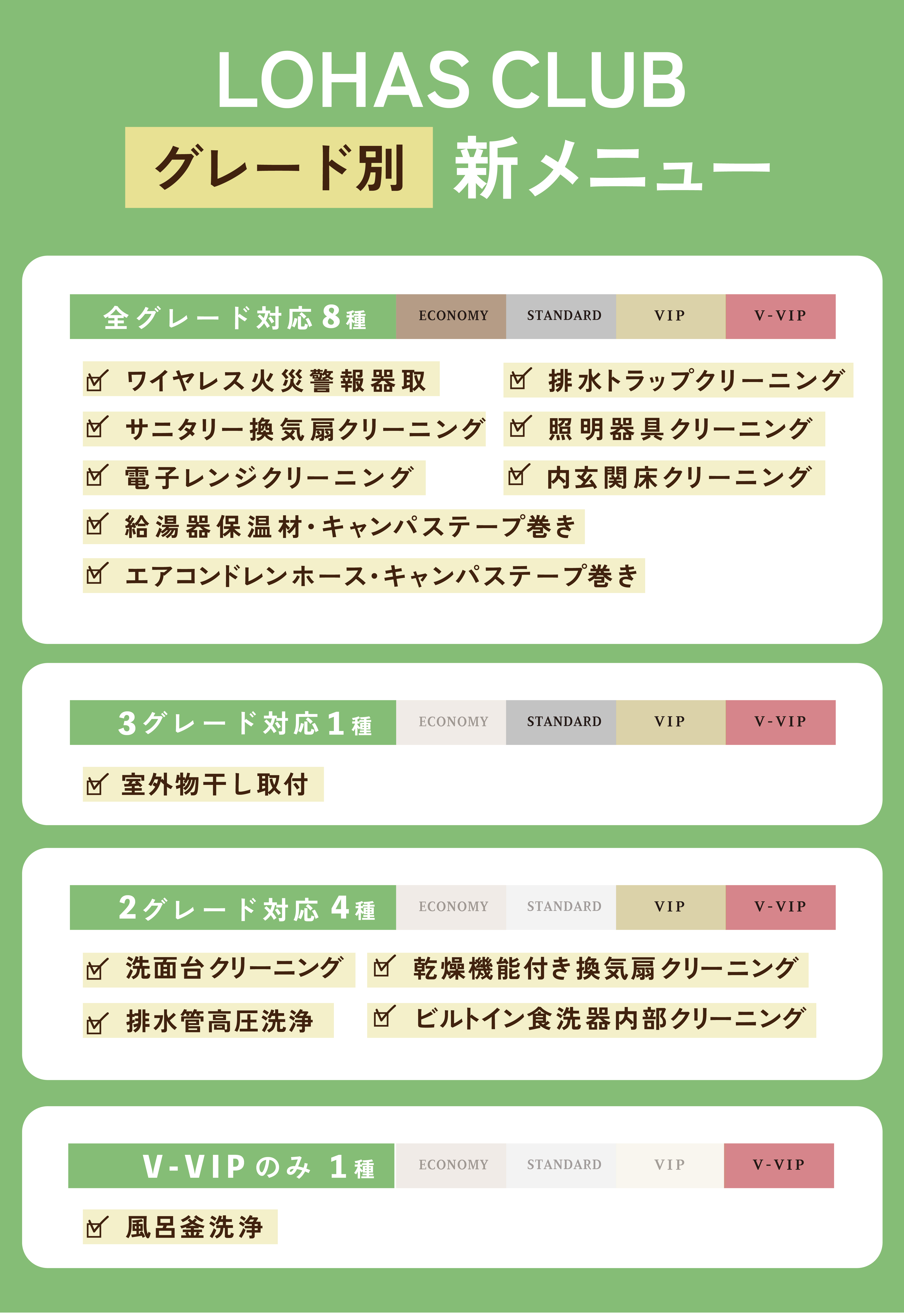 今回新たに追加されたのは、室内外の清掃や設備まわりのメンテナンスなど実用的なサービスばかり。 とくにご要望の多かった お風呂や換気扇の洗浄、物干し金物の設置などが新登場しています。