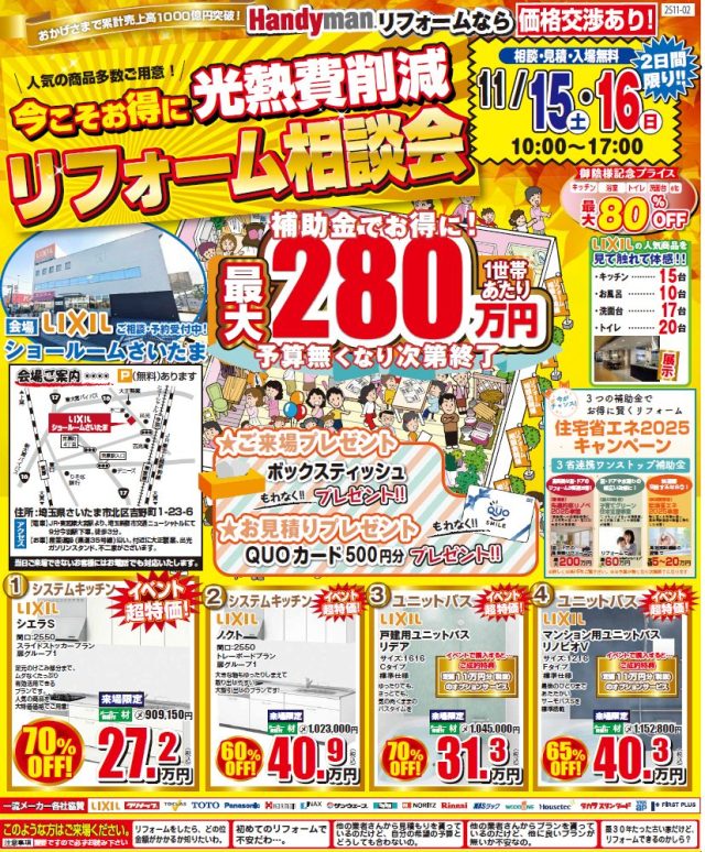 今こそお得に光熱費削減!補助金で最大280万円お得に!! 11/15(土)・16(日)LIXIL さいたまショールームにてリフォーム相談会 さらに!! インプラス首都圏販売実績 第1位 全額返金キャンペーンも同時開催中! ![]() ![]() ◆このようなお悩みがある方にオススメ♪・リフォームをしたら、どれくらい金額がかかるのか
