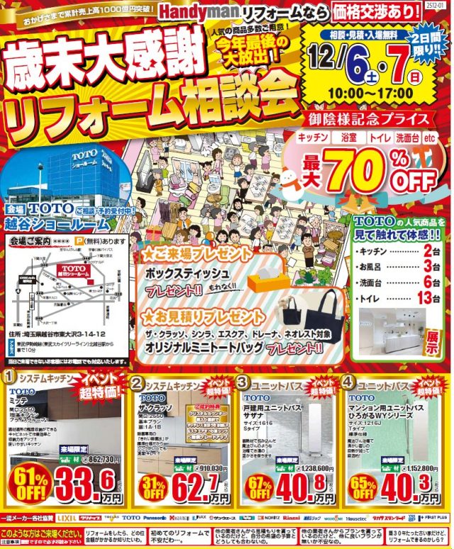 歳末大感謝!リフォーム相談会!! 12/6-7(土-日)越谷ショールームにてリフォーム相談会 さらに!! インプラス首都圏販売実績 第1位 全額返金キャンペーンも同時開催中! ![]() ![]() ◆このようなお悩みがある方にオススメ♪・リフォームをしたら、どれくらい金額がかかるのか