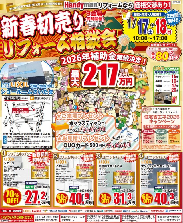 新春初売り!補助金で最大217万円お得に!! 1/17(土)・18(日)LIXIL さいたまショールームにてリフォーム相談会 さらに!! インプラス首都圏販売実績 第1位 全額返金キャンペーンも同時開催中! ![]() ![]() ◆このようなお悩みがある方にオススメ♪・リフォームをしたら、どれくらい金額がかかるのか