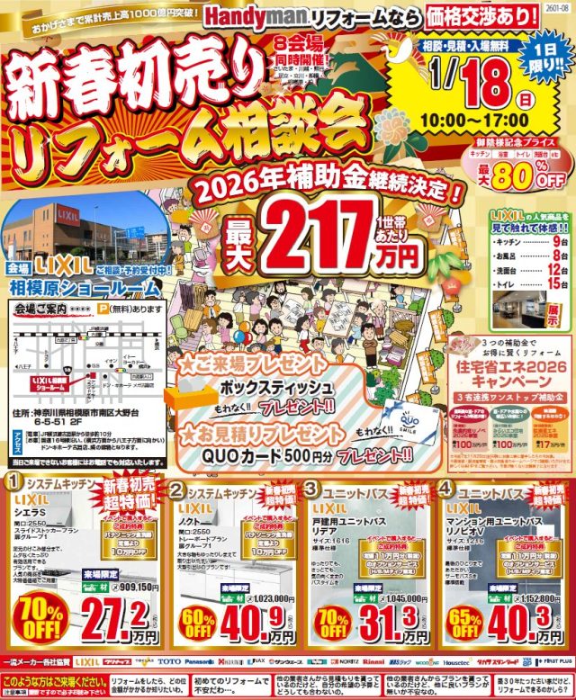 新春初売り!補助金で最大217万円お得に!! 1月17・18日LIXIL 相模原ショールームにてリフォーム相談会 さらに!! インプラス首都圏販売実績 第1位 全額返金キャンペーンも同時開催中! ![]() ![]() ◆このようなお悩みがある方にオススメ♪・リフォームをしたら、どれくらい金額がかかるのか