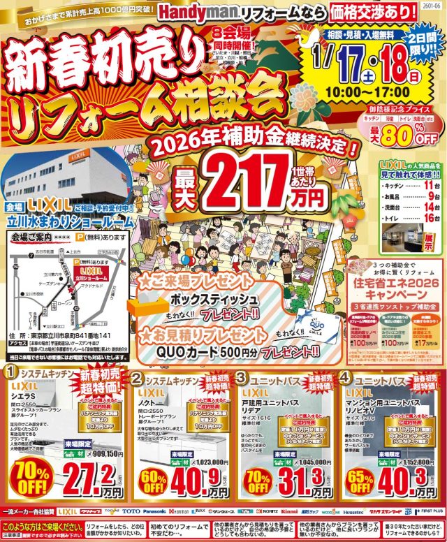 新春初売り!最大217万円 補助金でお得に!! 1/17、18(土,日) LIXIL立川水まわりショールームにてリフォーム相談会 さらに!! インプラス首都圏販売実績 第1位 全額返金キャンペーンも同時開催中! ![]() ![]() ![]() ◆このようなお悩みがある方にオススメ♪・リフォームをしたら、どれくらい金額がかかるのか