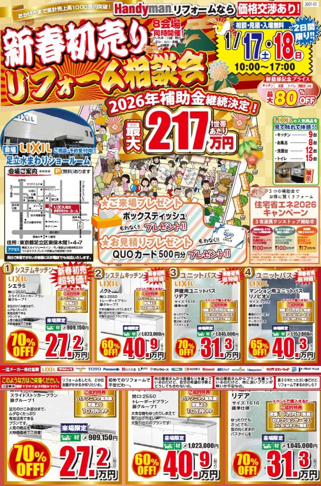 新春初売り!イベント限定大特価!! 1/17,18(土,日)LIXIL 足立水まわりショールームにてリフォーム相談会 さらに!! インプラス首都圏販売実績 第1位 全額返金キャンペーンも同時開催中! ![]() ![]() ◆このようなお悩みがある方にオススメ♪・リフォームをしたら、どれくらい金額がかかるのか