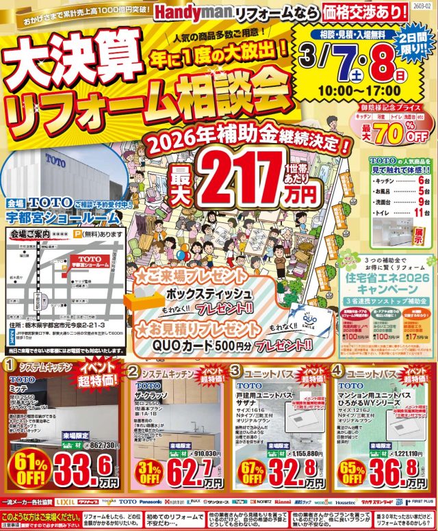大決算!補助金最大217万円!! 3/7-8(土-日) TOTO 宇都宮ショールームにてリフォーム相談会 さらに!! インプラス首都圏販売実績 第1位 全額返金キャンペーンも同時開催中! ![]() ![]() ◆このようなお悩みがある方にオススメ♪・リフォームをしたら、どれくらい金額がかかるのか