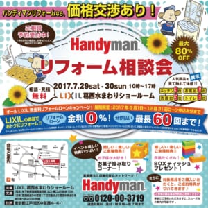 11月18日(土)と11月19日(日)の2日間は【クリナップ江戸川ショールーム】にて、Handymanリフォーム相談会を開催いたします。 クリナップ江戸川ショールームは今年9月15日にマンションリフォームに焦点を当てた都市型ショールームとして新設オープンしたショールームです。 人気のシステムバスルームやシステムキッチンが驚きの相談会限定の大特価でご提供!