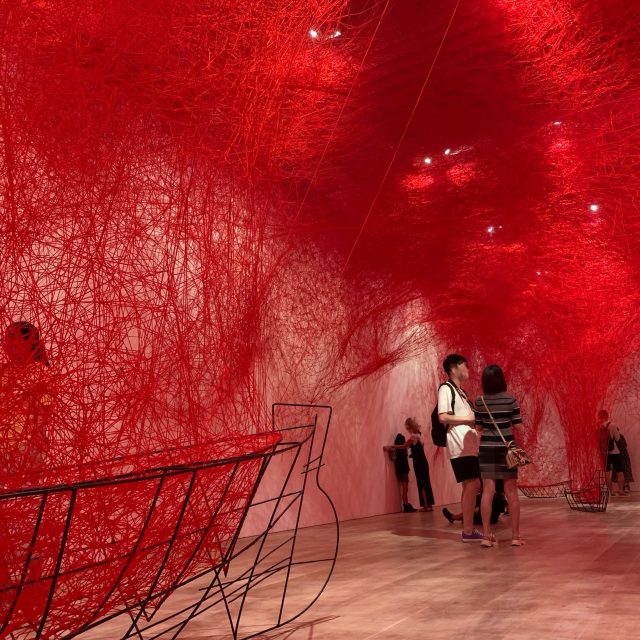入ってすぐにこの「不確かな旅」という作品がありました。 赤い糸で覆いつくされた空間は大迫力でとてもダイナミックでした。